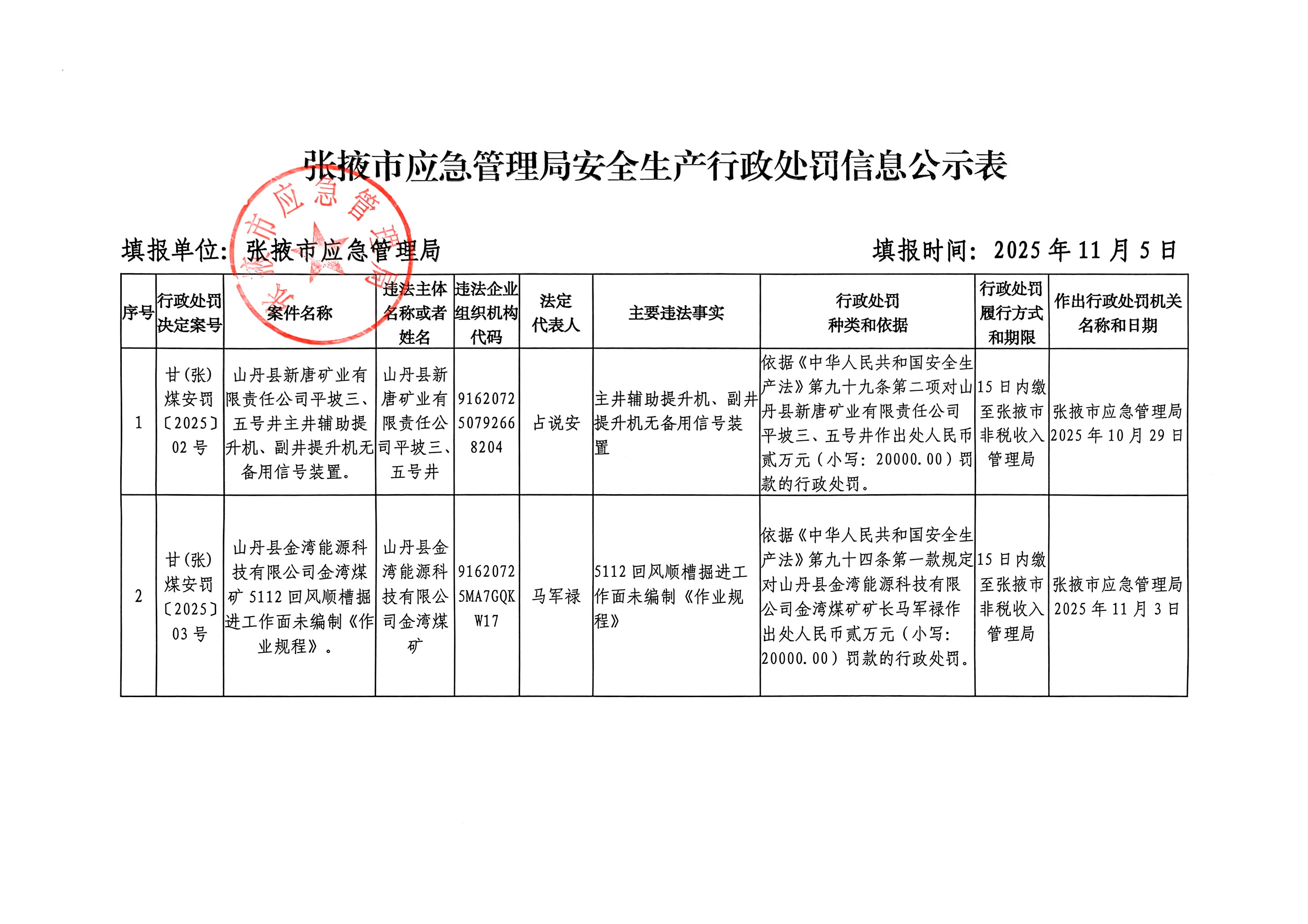 張掖市應(yīng)急管理局安全生產(chǎn)行政處罰信息公示
