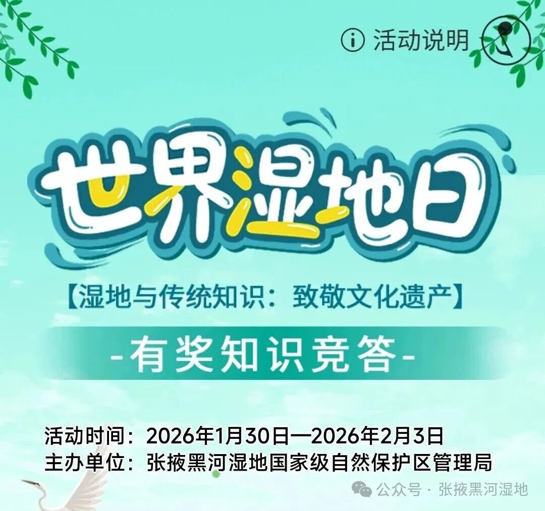 2026年2月2日,我們迎來了第30個(gè)“世界濕地日”。張掖黑河濕地國家級(jí)自然保護(hù)區(qū)管理局精心策劃、統(tǒng)籌推進(jìn),組織開展了形式多樣、覆蓋面廣、實(shí)效性強(qiáng)的“世界濕地日”系列宣傳活動(dòng),全方位傳遞濕地保護(hù)理念,凝聚生態(tài)守護(hù)共識(shí)。