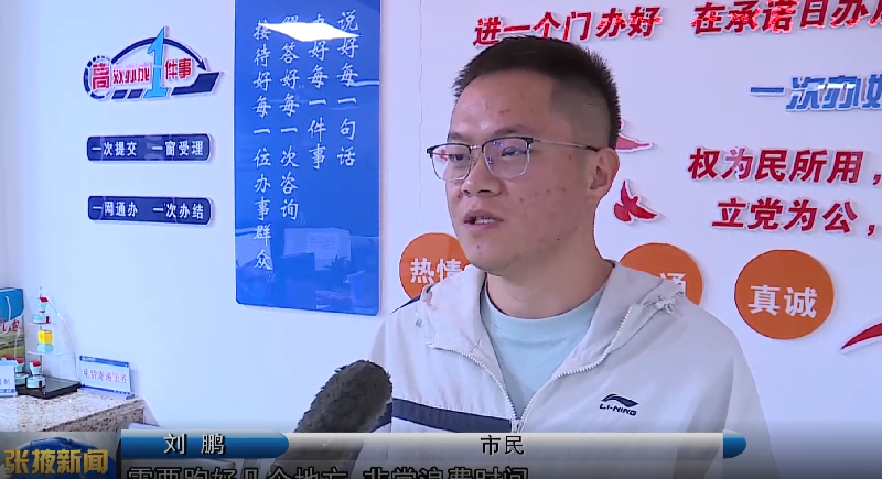 在民樂(lè)縣政務(wù)大廳市場(chǎng)監(jiān)管局窗口,市民劉鵬為新成立的公司辦理營(yíng)業(yè)執(zhí)照。他告訴記者,不到兩個(gè)小時(shí)的時(shí)間,完成了所有手續(xù)。