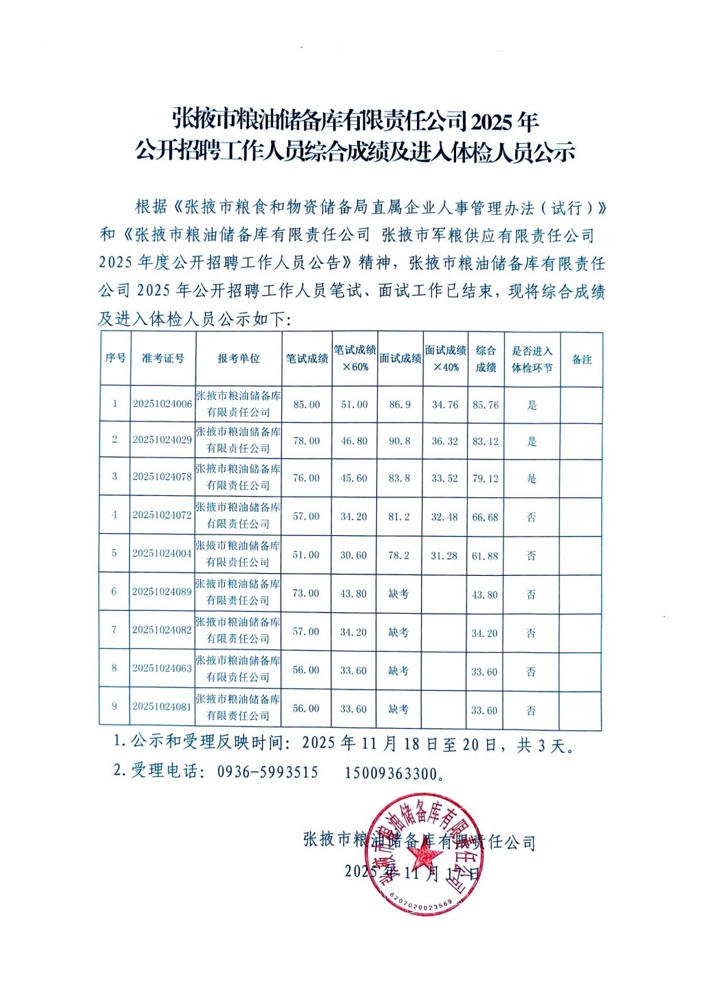張掖市糧油儲(chǔ)備庫有限責(zé)任公司2025年公開招聘工作人員綜合成績及進(jìn)入體檢人員公示