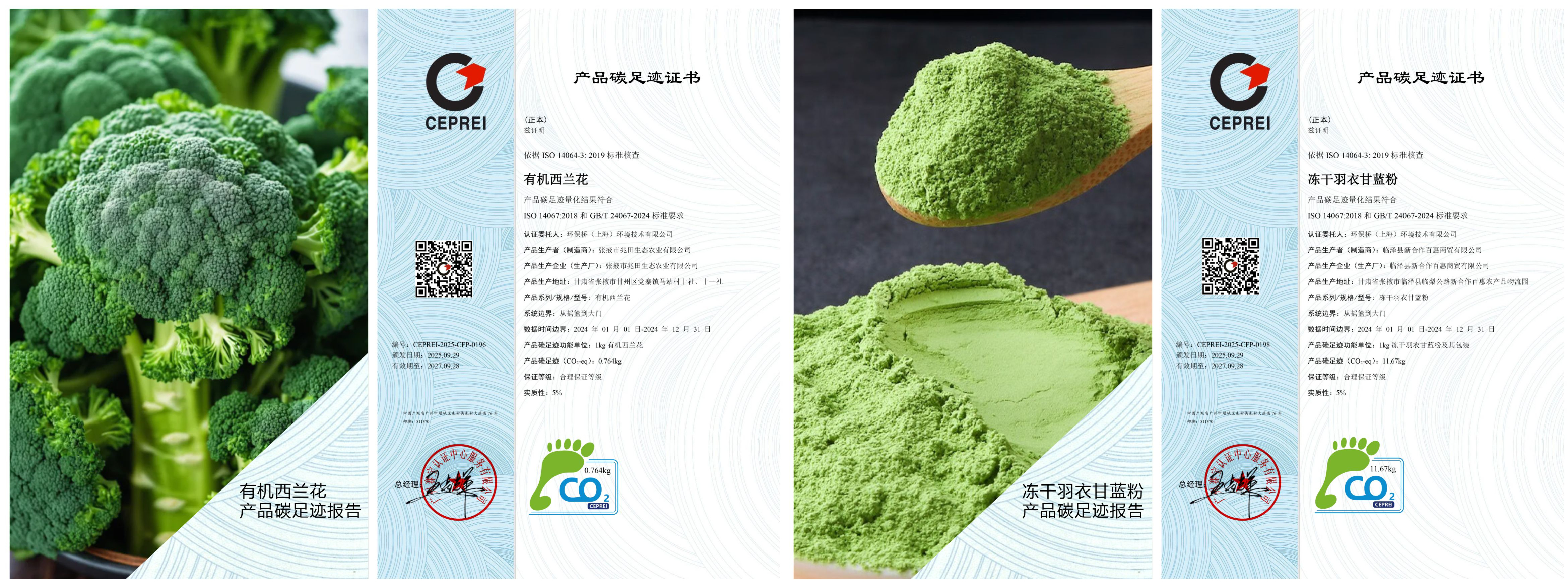 碳標(biāo)簽被譽(yù)為農(nóng)產(chǎn)品的“綠色通行證”,清晰標(biāo)注產(chǎn)品從種植、加工到流通全生命周期的碳排放量,是破解生態(tài)產(chǎn)品價值轉(zhuǎn)化難題、提升市場競爭力的關(guān)鍵抓手。通過認(rèn)證的6個品類中,多項突破樹立行業(yè)標(biāo)桿,2024年11月獲批的甘州娃娃菜,是甘肅省首個農(nóng)產(chǎn)品碳標(biāo)簽認(rèn)證,其每千克碳排放僅0.375千克二氧化碳當(dāng)量,成為同類產(chǎn)品低碳發(fā)展的示范標(biāo)桿;2025年同步獲批的凍干羽衣甘藍(lán)粉,更是斬獲全國首例該品類碳標(biāo)簽認(rèn)證,填補(bǔ)了全球該領(lǐng)域碳足跡核算的空白,為張掖農(nóng)產(chǎn)品對接歐盟碳邊境調(diào)節(jié)機(jī)制(CBAM)等國際規(guī)則、拓展海外市場提供了寶貴的實踐經(jīng)驗。