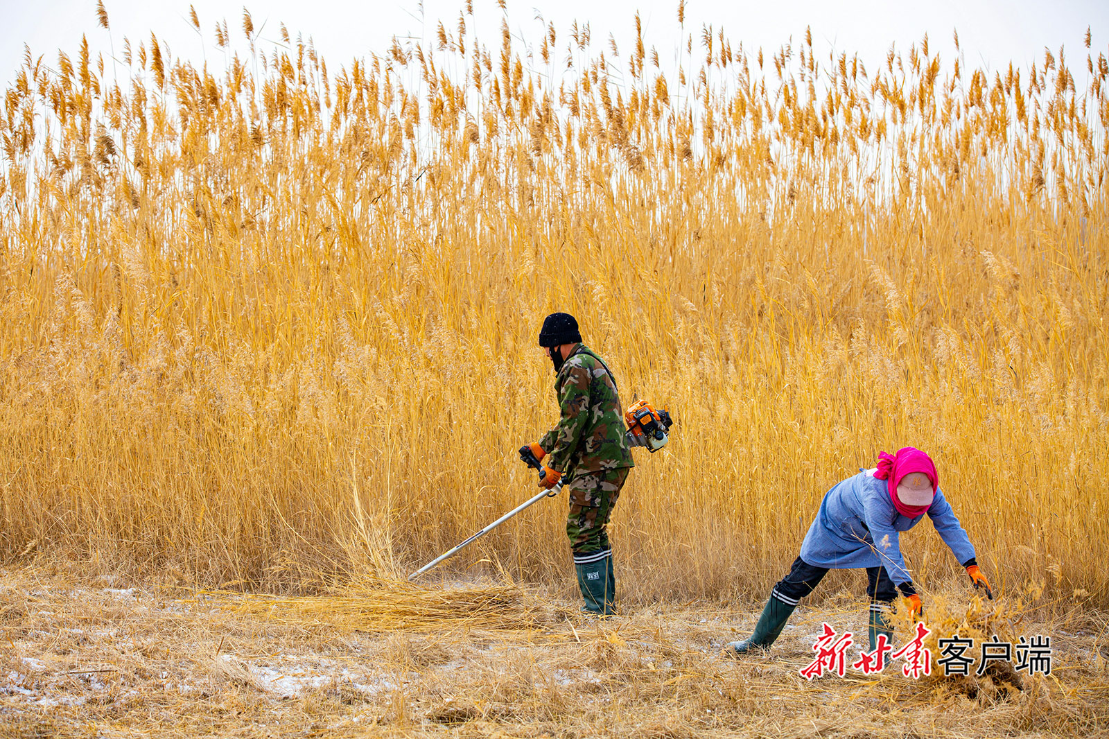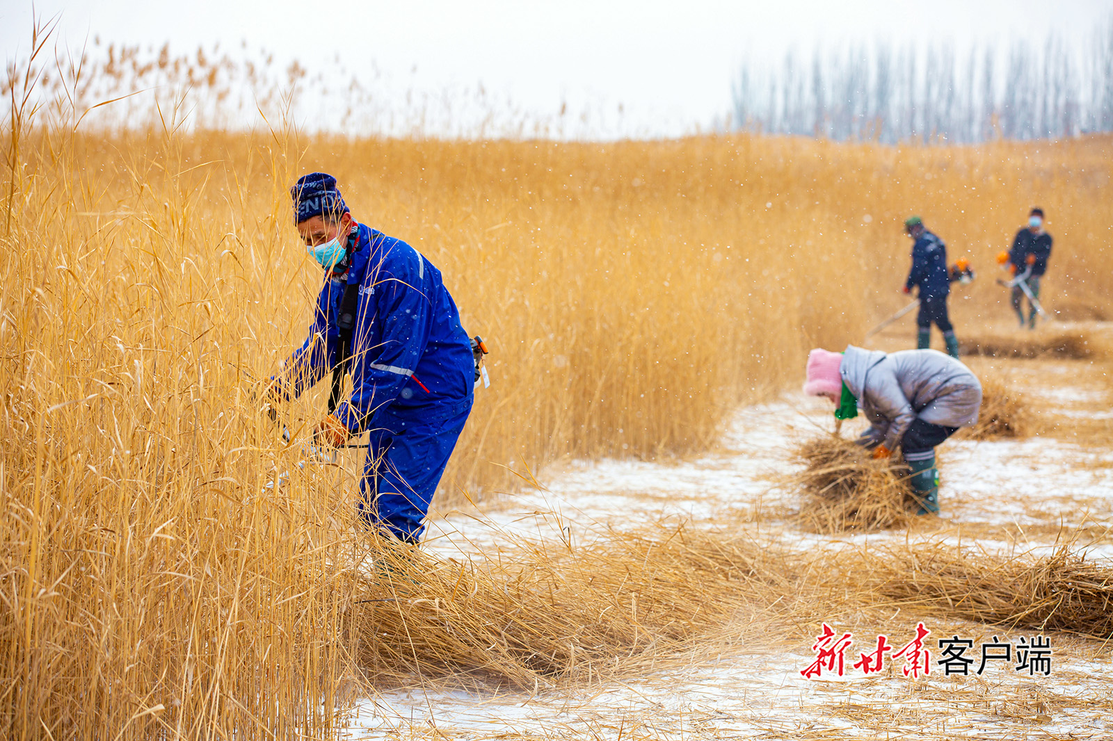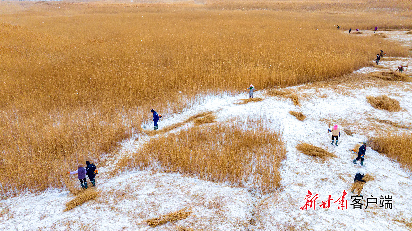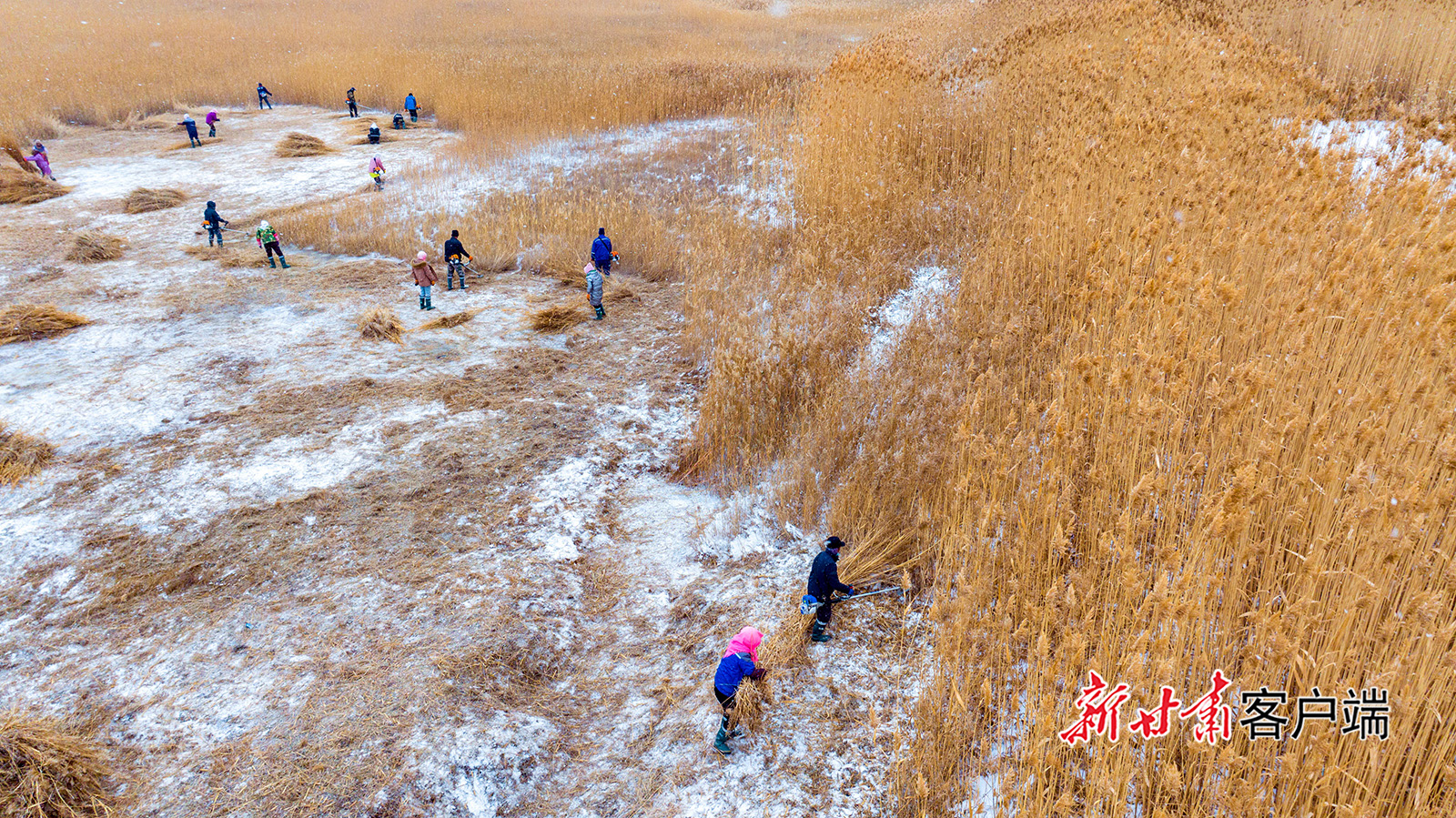 1月2日,張掖國(guó)家濕地公園的蘆葦蕩里,工人正在風(fēng)雪中收割、打捆蘆葦。隆冬時(shí)節(jié),張掖濕地管理部門將近3萬(wàn)畝濕地蘆葦分區(qū)域招標(biāo)承包,加快蘆葦收割進(jìn)度。收割的大量蘆葦提供養(yǎng)殖小區(qū)或治沙站,助力生態(tài)養(yǎng)殖和治沙,提高了葦草利用率。