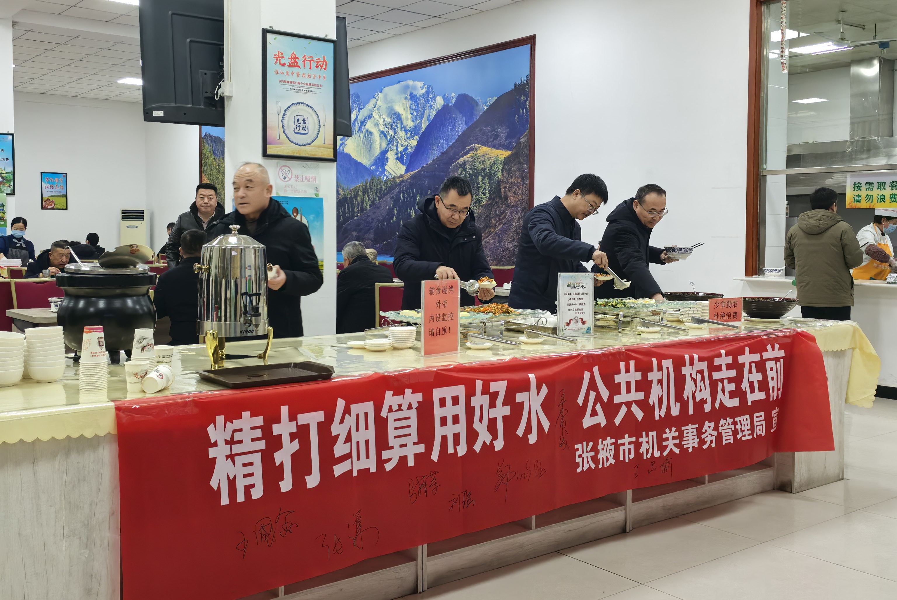 線下陣地營(yíng)造濃厚氛圍。活動(dòng)充分利用各公共機(jī)構(gòu)辦公區(qū)域的宣傳欄、電子顯示屏等實(shí)體平臺(tái),高頻次滾動(dòng)播放節(jié)水主題海報(bào)、公益廣告與政策法規(guī)。全市累計(jì)發(fā)放節(jié)水主題海報(bào)4000份、倡議書(shū)5000份,確保宣傳材料覆蓋廣泛、觸目可及。12月25日上午,我局在市政府機(jī)關(guān)食堂成功舉辦了以“精打細(xì)算用好水,公共機(jī)構(gòu)走在前”為主題的現(xiàn)場(chǎng)宣傳活動(dòng),干部職工踴躍在節(jié)水承諾橫幅上簽名,表達(dá)了踐行節(jié)水責(zé)任的決心,增強(qiáng)了活動(dòng)的互動(dòng)性與感染力。