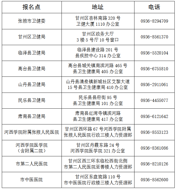 張掖考點下設(shè)市衛(wèi)生健康委、甘州區(qū)、臨澤縣、高臺縣、山丹縣、民樂縣、肅南縣衛(wèi)生健康局及河西學(xué)院附屬張掖人民醫(yī)院、河西學(xué)院醫(yī)學(xué)院、市第二人民醫(yī)院、市中醫(yī)醫(yī)院等11個報名點。各報名點具體負(fù)責(zé)考試報名現(xiàn)場確認(rèn)、相關(guān)證明材料收集上報等工作。市直醫(yī)療衛(wèi)生單位、市直教育系統(tǒng)的報名工作由市衛(wèi)生健康委負(fù)責(zé),河西學(xué)院衛(wèi)生專業(yè)技術(shù)人員報名工作由河西學(xué)院附屬張掖人民醫(yī)院、河西學(xué)院醫(yī)學(xué)院按照管理權(quán)限分別負(fù)責(zé),其他考生報名由各縣區(qū)根據(jù)轄區(qū)范圍分別負(fù)責(zé),民營醫(yī)療機構(gòu)報名由所在地報名點負(fù)責(zé)。