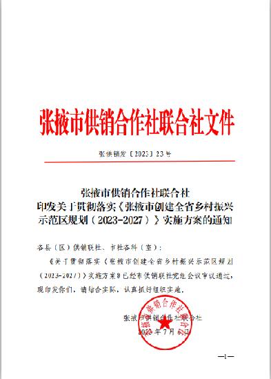 供銷合作社是黨領(lǐng)導下的為農(nóng)服務(wù)的綜合性合作經(jīng)濟組織,是實施鄉(xiāng)村振興戰(zhàn)略,推動農(nóng)業(yè)農(nóng)村現(xiàn)代化的重要力量。為認真貫徹落實《張掖市創(chuàng)建全省鄉(xiāng)村振興示范區(qū)規(guī)劃(2023-2027)》和市委、市政府關(guān)于推進“一高地四區(qū)”建設(shè)的部署要求,持續(xù)深化供銷社綜合改革,著力發(fā)揮好供銷社助力鄉(xiāng)村振興的獨特優(yōu)勢,現(xiàn)制定如下實施方案。