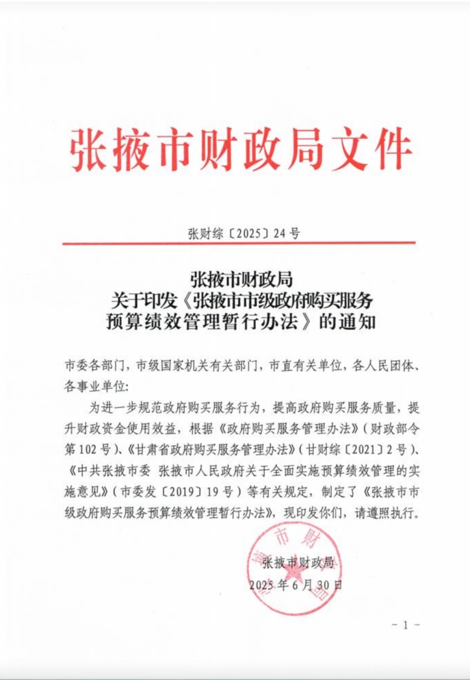張掖市財(cái)政局關(guān)于印發(fā)《張掖市市級(jí)政府購(gòu)買服務(wù)預(yù)算績(jī)效管理暫行辦法》的通知